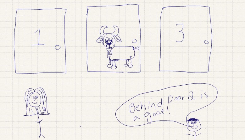 Behind one door is a brand new car. The other two doors have a goat behind each one.The game show host asks you to pick the door you think has the car. He then opens one of the other two doors, revealing a goat.